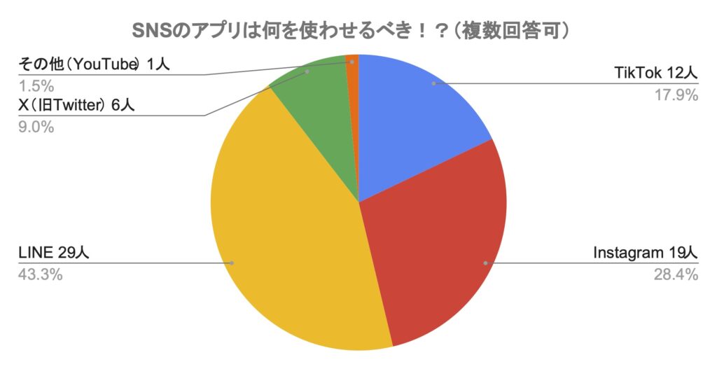 人気アプリの中でも圧倒的に使用率が高かったのはLINEで、理由としては連絡手段の一つとして使わせているという声が多いようでした。InstagramやTikTok、そしてXに関しては「使わせているけど見る専門で、投稿はさせない」という意見もかなり多くありました。投稿はもっとSNSの知識が深まってから……と考えているようです。またYouTubeは、ほとんどの家庭がタブレット、もしくはパソコンで見せているようで、スマホでアプリを入れているというのはわずか一件のみ、という結果に。