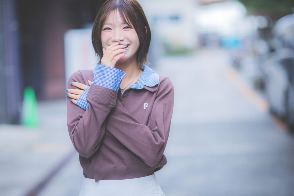「いや、これも多分TikTokで教えてもらったんですけど、自分のまましゃべろうとするとやっぱり難しいんですよ。だから別の人格を演じた方がしゃべりやすいんです。自分がしゃべれないなら、他の誰かになってしまおう、ってことだと思うんですけど。この考え方は焼肉屋のバイトではもちろん、SNSで発信をするときもすごく役立ちました。私の場合は母がすごくおしゃべりなので、まずは自分を母だと思い込んで、母のしゃべり方や声色をマネしてしてみることから始めてみたんです。そうすることで、まずは“しゃべる”ということができるようになってきました。しゃべる内容はなんでもいいんですけど、相手が着ている服とか、そのとき目に入ったものから話題にしてみると話しやすかったですね。『そのニットかわいいですね』とか。中高生やと人見知りに悩んでる子も多いと思うんですけど、このやり方めっちゃオススメです!」