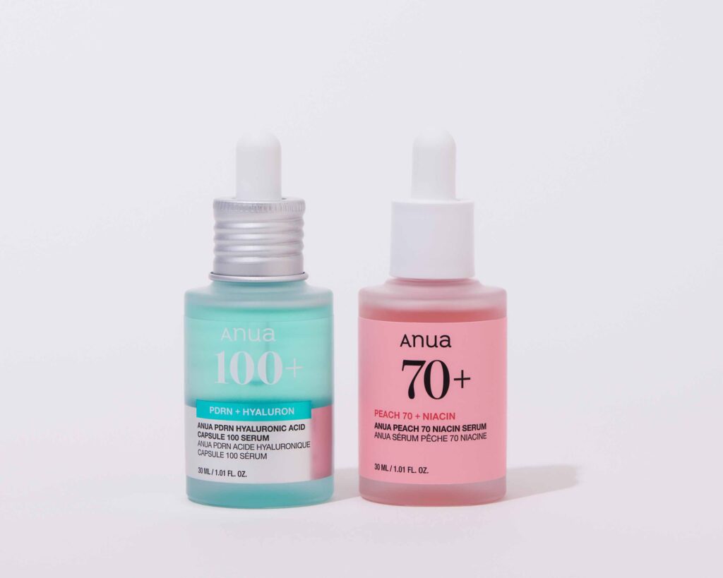 (左から)Anua PDRNヒアルロン酸カプセル100セラム 30ml ¥3450、Anua 桃70ナイアシンセラム 30ml ¥2800/ともにAnua