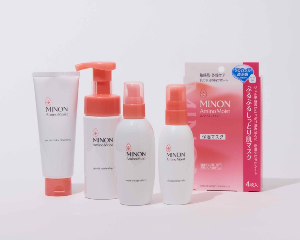 (左から)ミノン アミノモイスト モイストミルキィ クレンジング 100g ¥1650、ミノン アミノモイスト ジェントルウォッシュ ホイップ 150ml ¥1650、ミノン アミノモイスト モイストチャージ ローション Ⅱ もっとしっとりタイプ 150ml ¥2200、ミノン アミノモイスト モイストチャージ ミルク 100g ¥2310、ミノン アミノモイスト ぷるぷるしっとり肌マスク 22ml×4枚 ¥1320 ※すべて編集部調べ/第一三共ヘルスケア