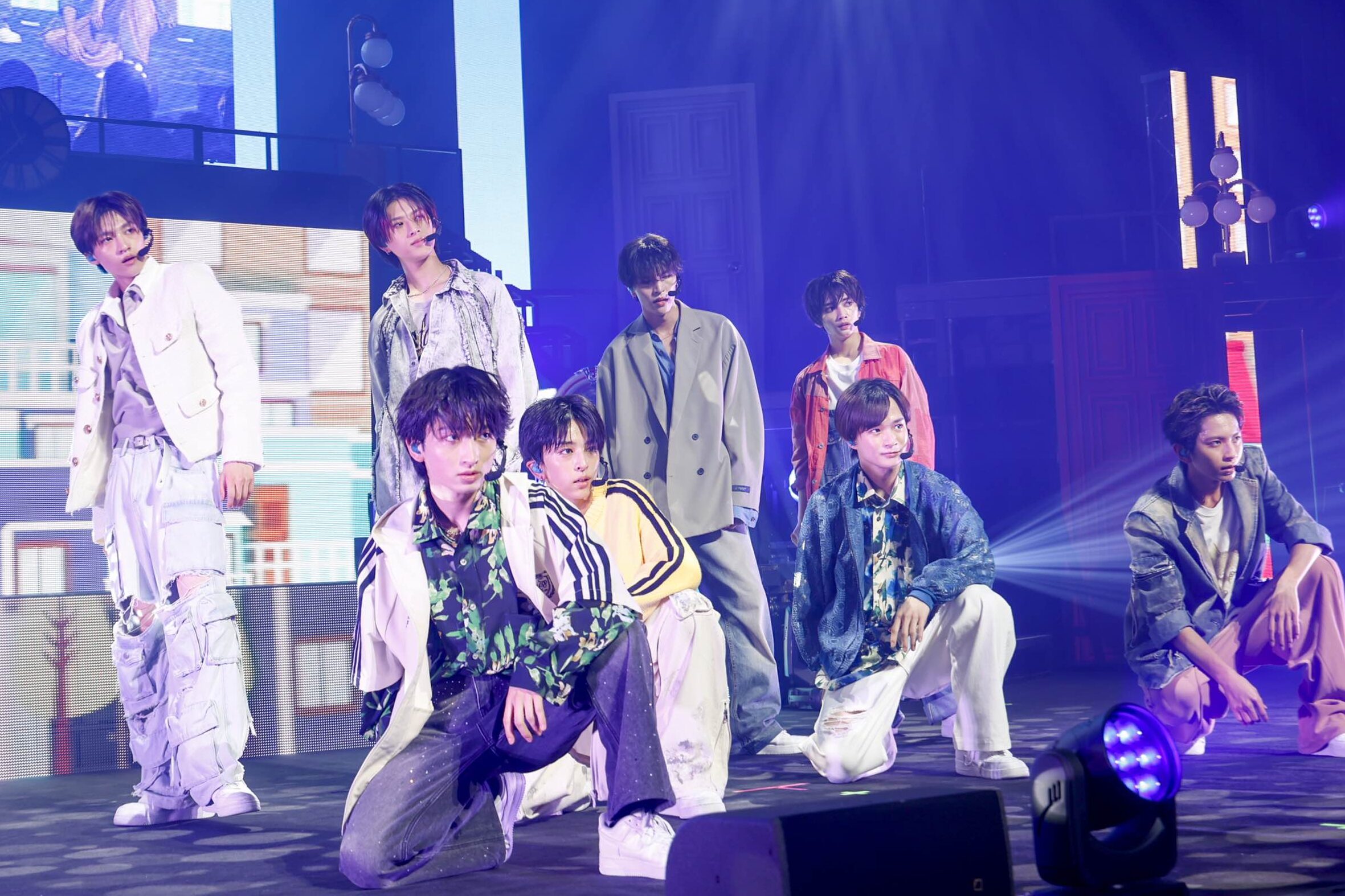 開演とともにスクリーンに映し出されたオープニングムービーの舞台は、メンバーが一緒に暮らす家、つまり“僕ん家”。メンバーカラーのルームウェアに身を包んだ8人が、アラームをかけて眠りについたところでムービーが終わると…。翌朝のアラーム音が会場中に大きく鳴り響き、オープニングムービーの物語の続きがそのままステージ上で繰り広げられる展開に!ステージのあちこちにあるベッドや部屋の扉から、目を覚ました寝起きのメンバーたちが次々に出てくるというかわいい仕掛けに、会場からは早くも黄色い悲鳴が♡そして1曲目「Sunny Road」で爽やかにライブがスタート!この曲にはリョウスケも参加し、いつも通り歌ったり踊ったりはできないものの、隣で寄り添ってくれていた筒井俊旭くんと一緒に、明るい笑顔を届けていたよ。続けて2曲目に披露されたのは、デビュー曲の「CANDY」。ここでは場面が洗面所へと切り替わり、メンバーたちは歯磨きをしたり、ヘアセットをしたりと身支度を整えている様子。そして3曲目「Miracles」ではクローゼットへ。クールで大人な雰囲気のこの曲の途中では、ルームウェアから爆イケの普段着に着替えて再登場するというサプライズもあり、キュートさ炸裂の1,2曲目とはまたひと味違うICExの魅力に思わずきゅん♡そしてその爆イケビジュのまま、MCコーナーに突入~!