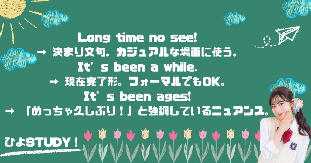 ーLong time no see./It’s been a while./It’s been a long time. など