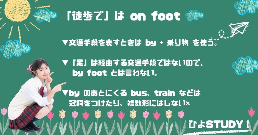 ー I go to school on foot.(私は徒歩で学校に行きます。)