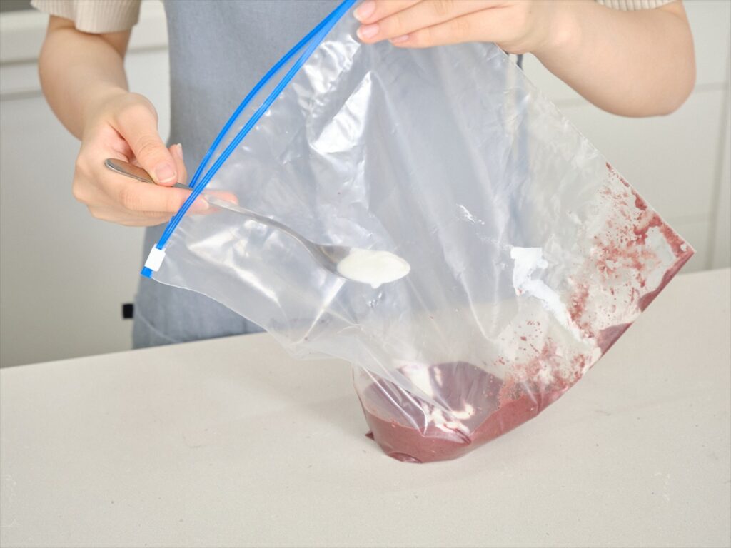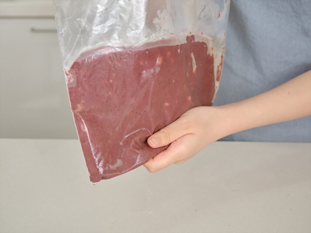 2. あらかじめ流水解凍したアサイーピューレ、ヨーグルトをすべて入れ、袋の外から手でもんで混ぜる。