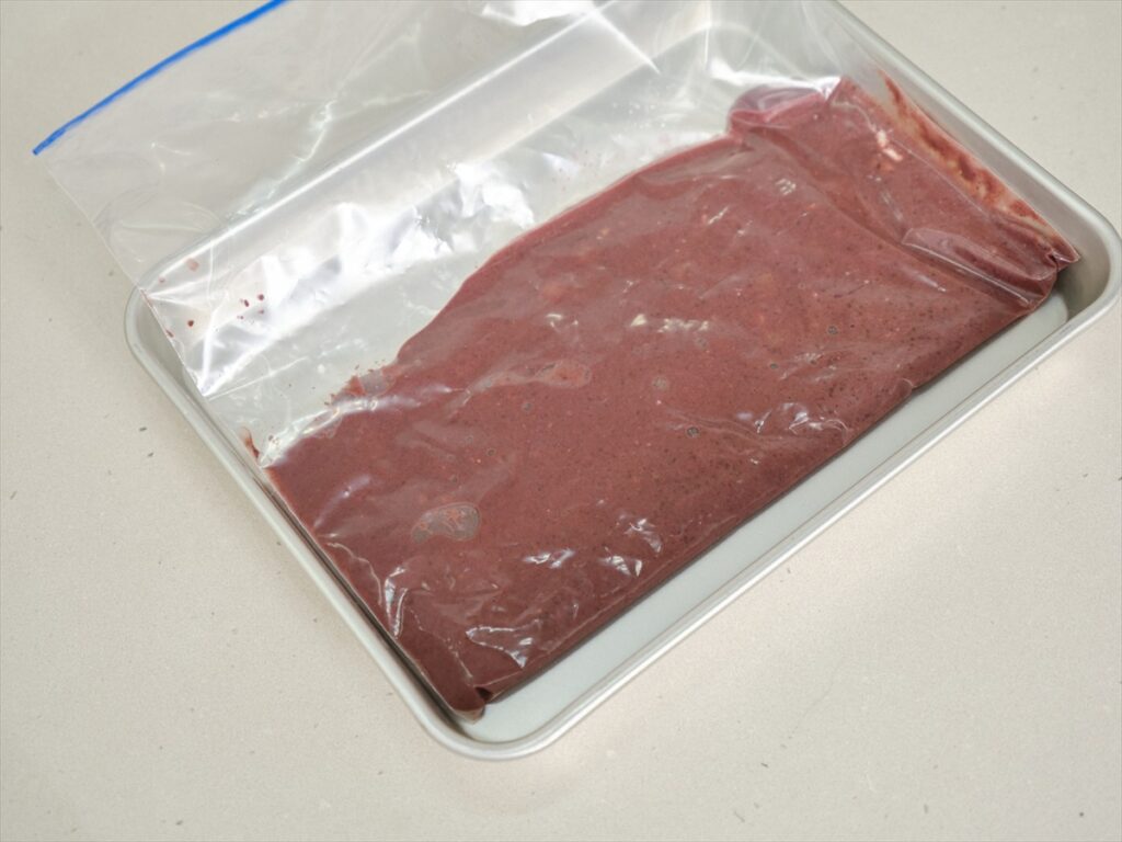3. バットに乗せて平らな状態にして、冷凍庫に約1時間ほど入れて冷やし凍らせていく。