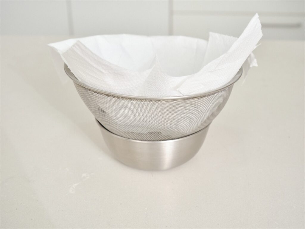 1. ザルにキッチンペーパーを敷き、底面が浮くようにひと回り小さいボウルの上にセットする。