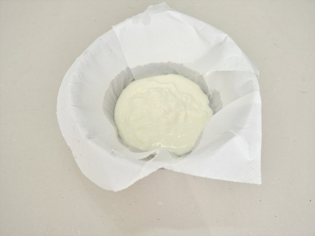 2. ザルにヨーグルトをすべて入れて、ラップをかけて冷蔵庫において約6時間水切りをする。