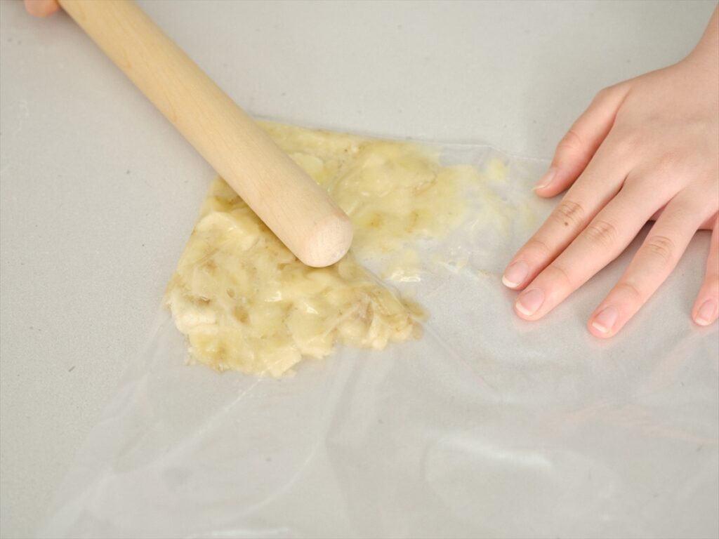 1. バナナを保存袋に入れ、めん棒で叩いてしっかりつぶす。保存袋は大きめサイズを使おう。