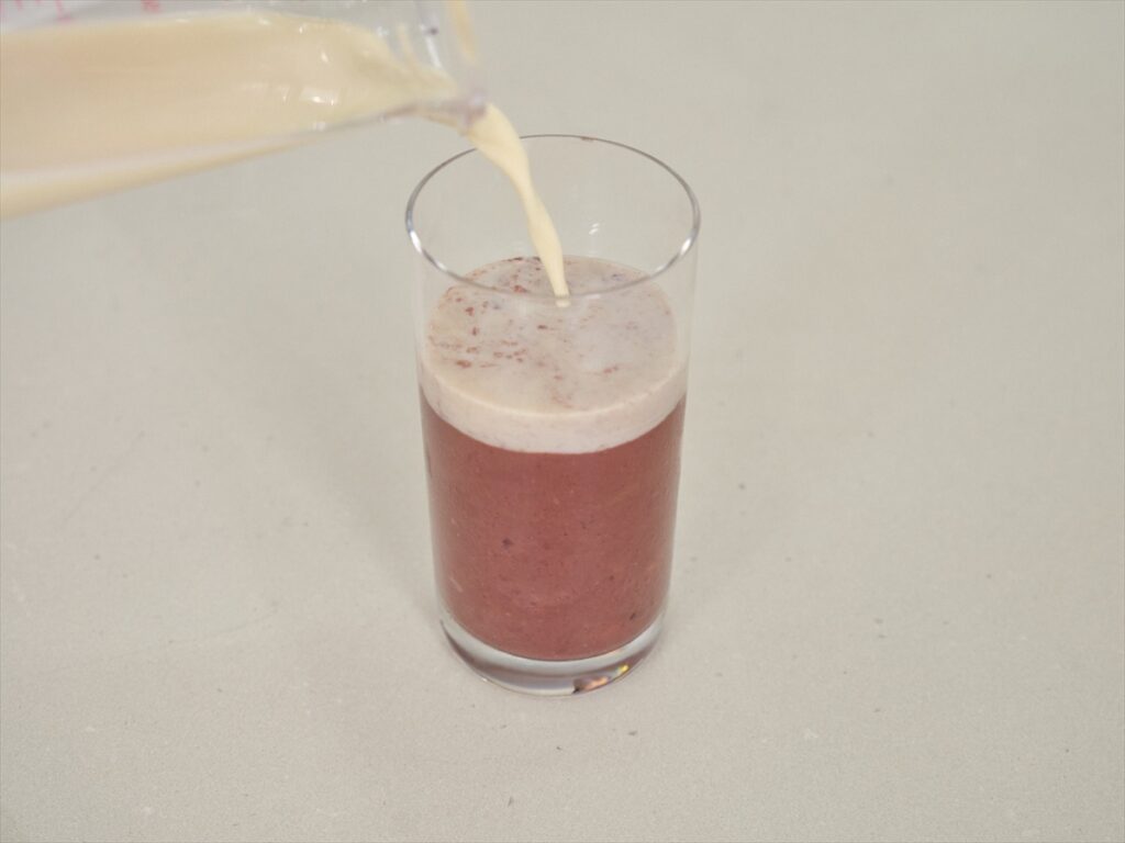 2. 上から豆乳を注ぐ。2つの層に分かれるよう、そーっと注ごう♪