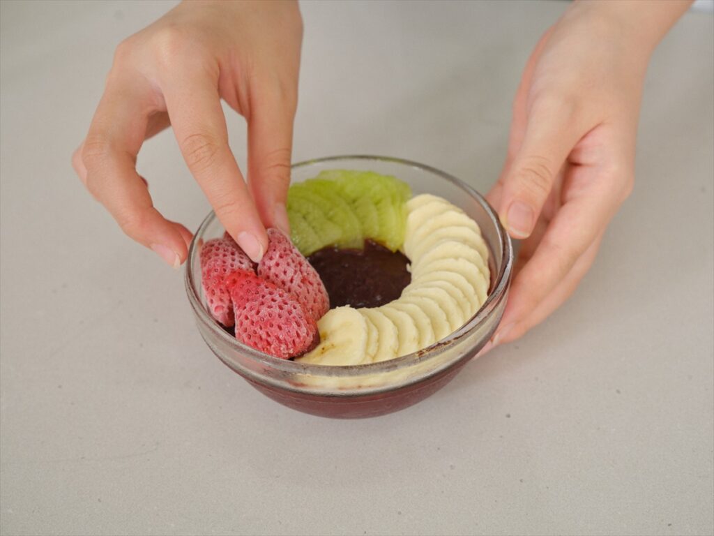 1. バナナなどフルーツを薄切りにしておく。ボウルにアサイーシャーベット入れて平らにし、その上にフルーツを乗せる。