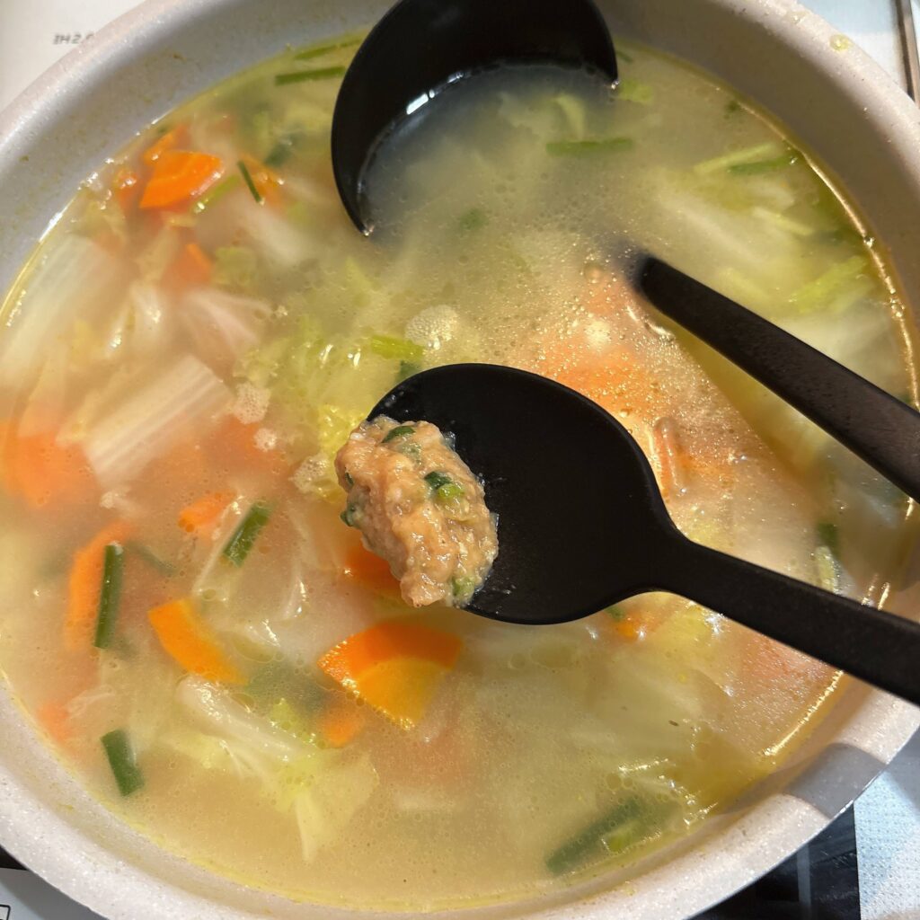 最後に卵を1つ割入れて混ぜたらスープにスプーンでそっと入れたら鶏団子になるらしい🥺💗