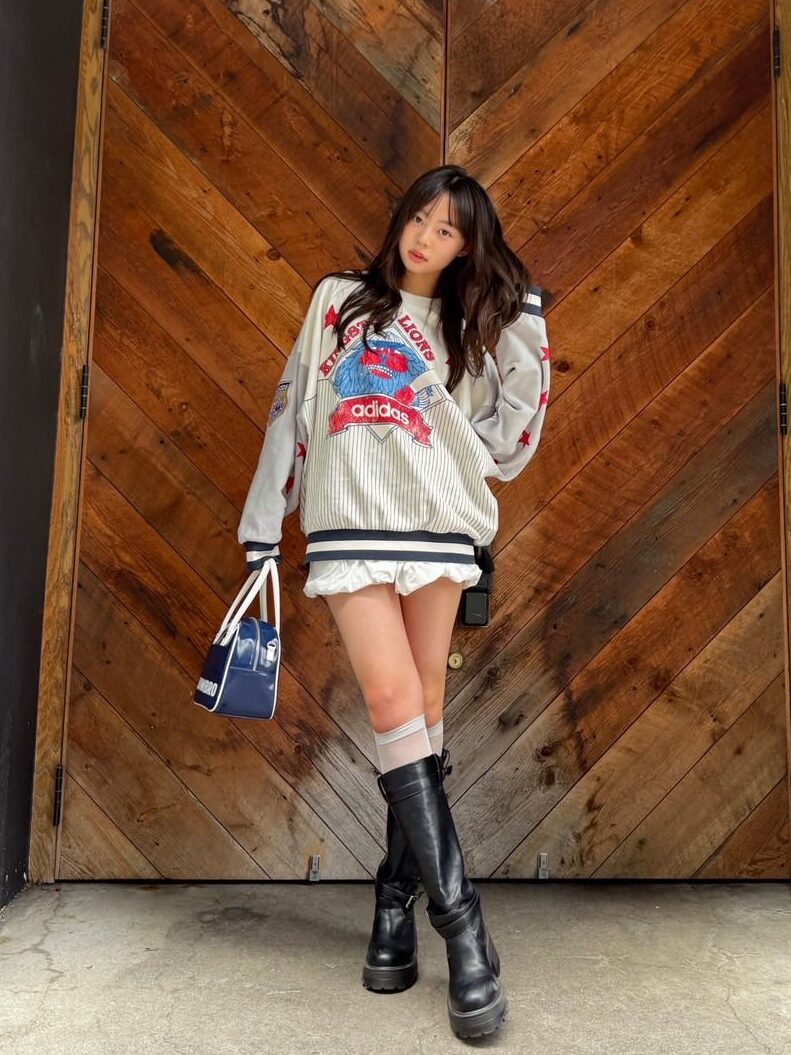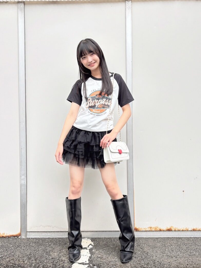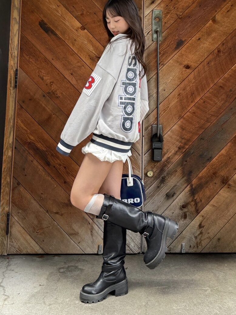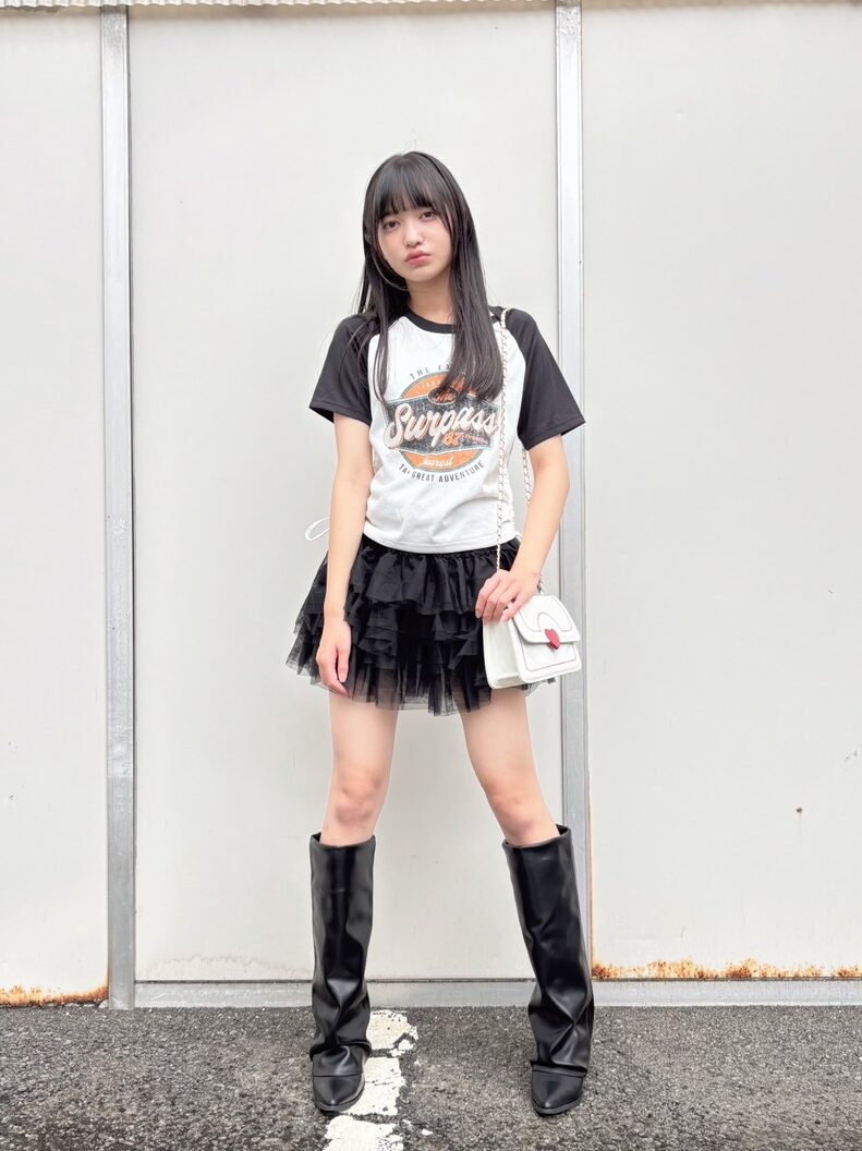 雑誌で見て可愛い!と思ったという、スウェット×バルーンスカートのコーデにトライしたユノ♡バルーンスカートがミニな分、シンプルな厚底ロングブーツを合わせて、肌見せのバランスを意識。ギャルっぽさもあるけど、ブーツの黒が全体を大人っぽい印象にまとめてくれているよ。