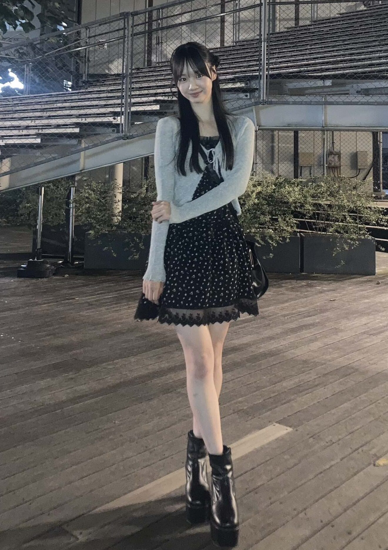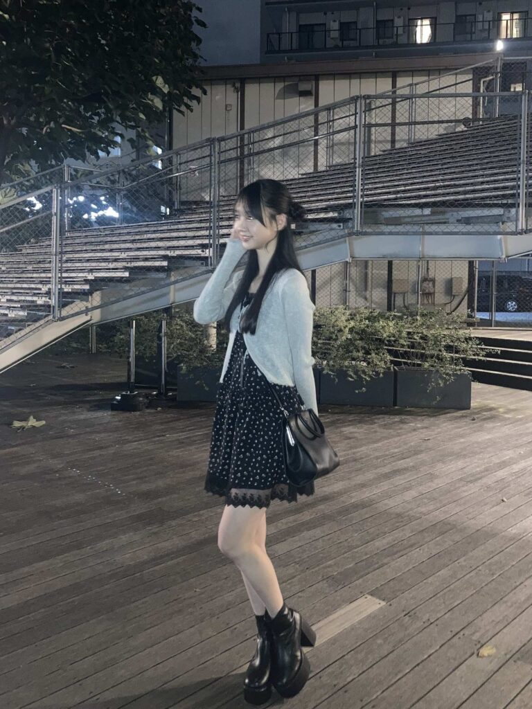 ショートブーツはしっかりヒールがあるタイプを選ぶのがコツ!何にでも合わせやすいし、自然にスタイルアップができるよ!黒のショートブーツは全体の印象を締めつつ、小花柄ワンピースを引き立ててくれるから、かわいさと大人っぽさの両方を演出できる♡今年らしいグレーのカーデで思いきりお姉さんぽく仕上げて。