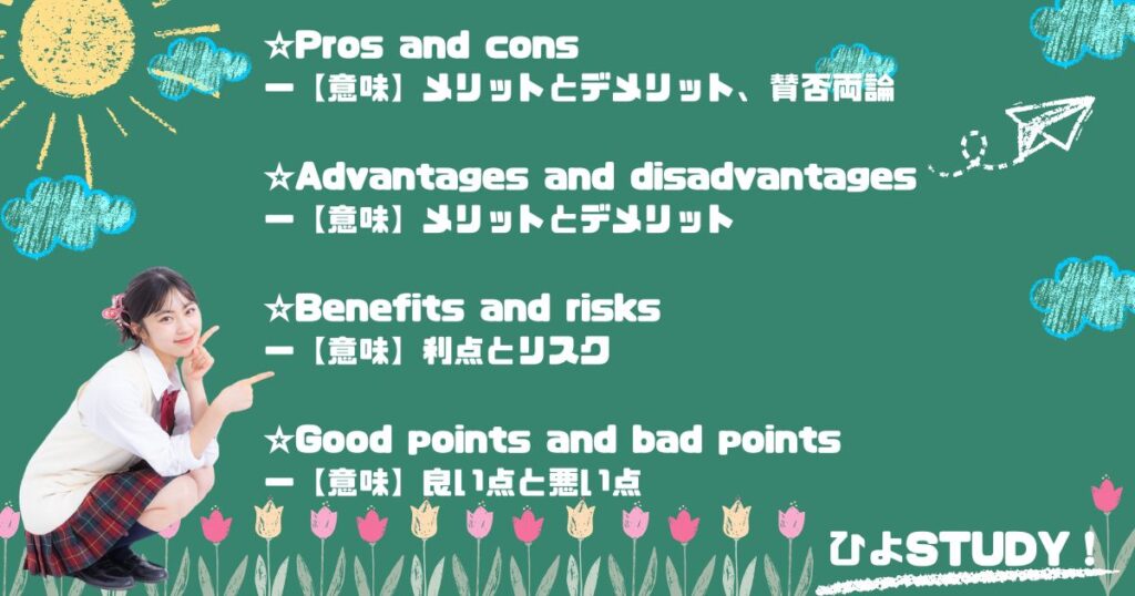 ⇒ネイティブスピーカーがよく使う「pros and cons」や「advantages and disadvantages」を使うのがおすすめ!