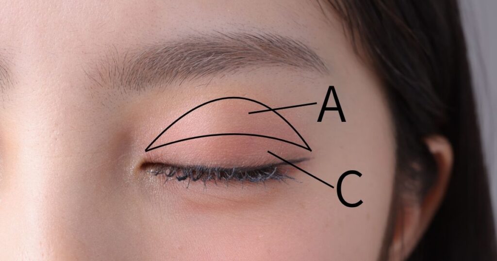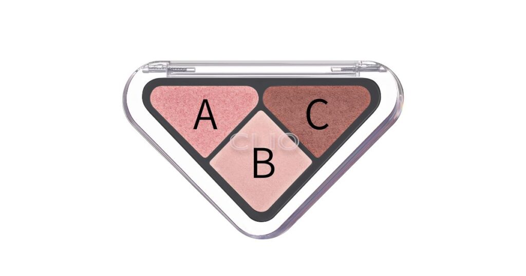 Aのピンクをアイホール全体に、Cのブラウンはアイホールの下半分にのせてグラデに。