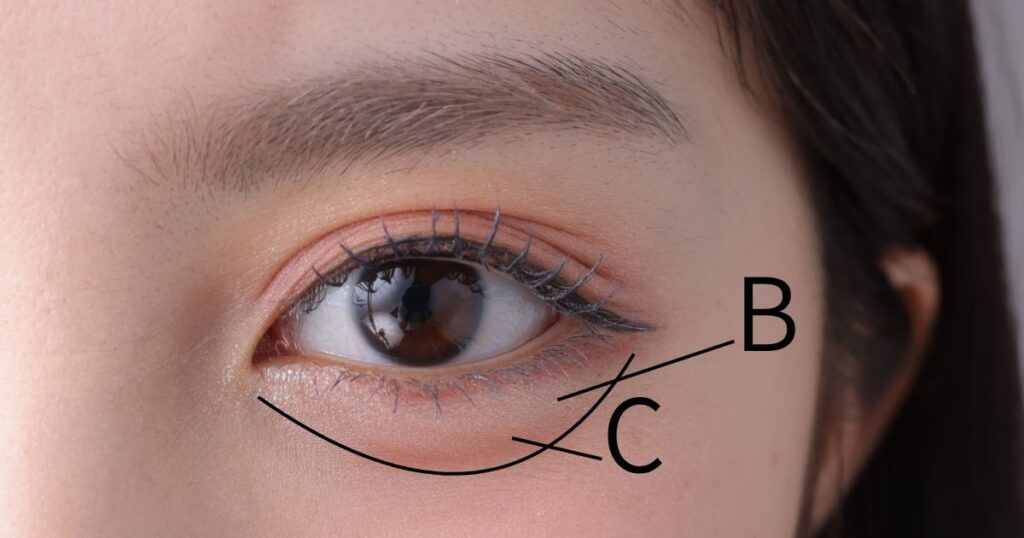 Bの薄ピンクを涙袋全体に。目頭&目尻をぼかす形でCブラウンで涙袋の下に影ライン!