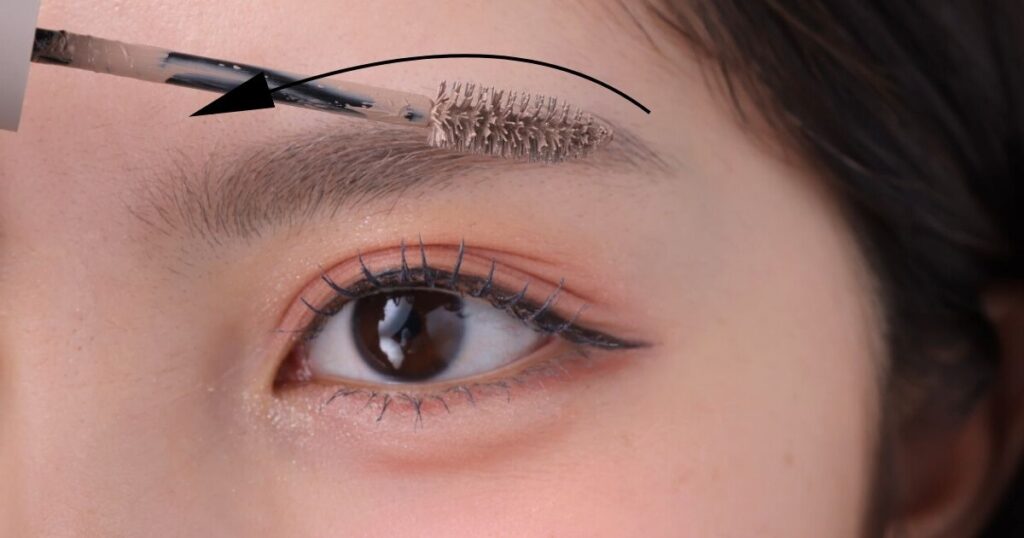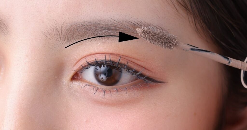 まゆマスカラは地肌につかないように、まゆ尻→まゆ頭に逆毛の方向で、次に毛流れを整えてぬるよ。