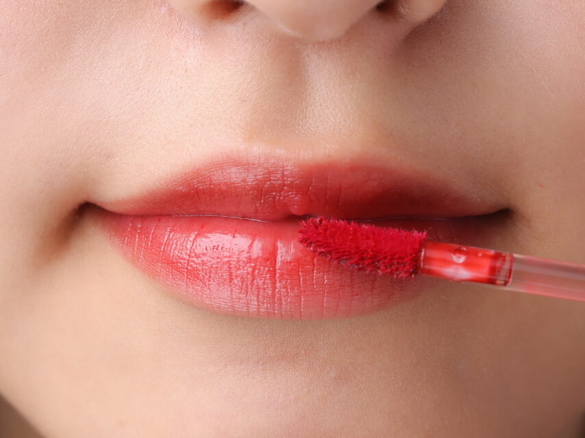 リップは指で全体ぬりした後に、チップで中央のみ重ねぬり。真ん中ぷっくりに仕上げよう。