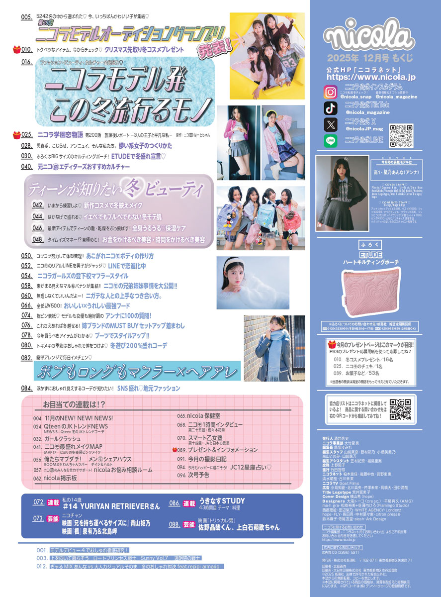 ニコラ12月号は、ニコラモデルオーディショングランプリの発表や、大人気コスメブランド「ETUDE」とのコラボ付録など、ビッグニュースが勢ぞろい♪