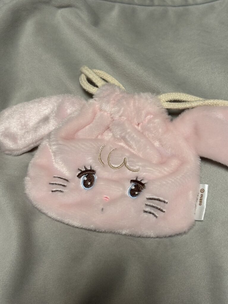 ヒナノ「mikkoというキャラクターのミニ巾着です!イヤホンとか充電器を入れるのにピッタリで、いつも持ち歩いてます!!リップを入れるのにもちょうどいい。ガチャガチャは日常使いできる系のものを回すことが多いかな!」