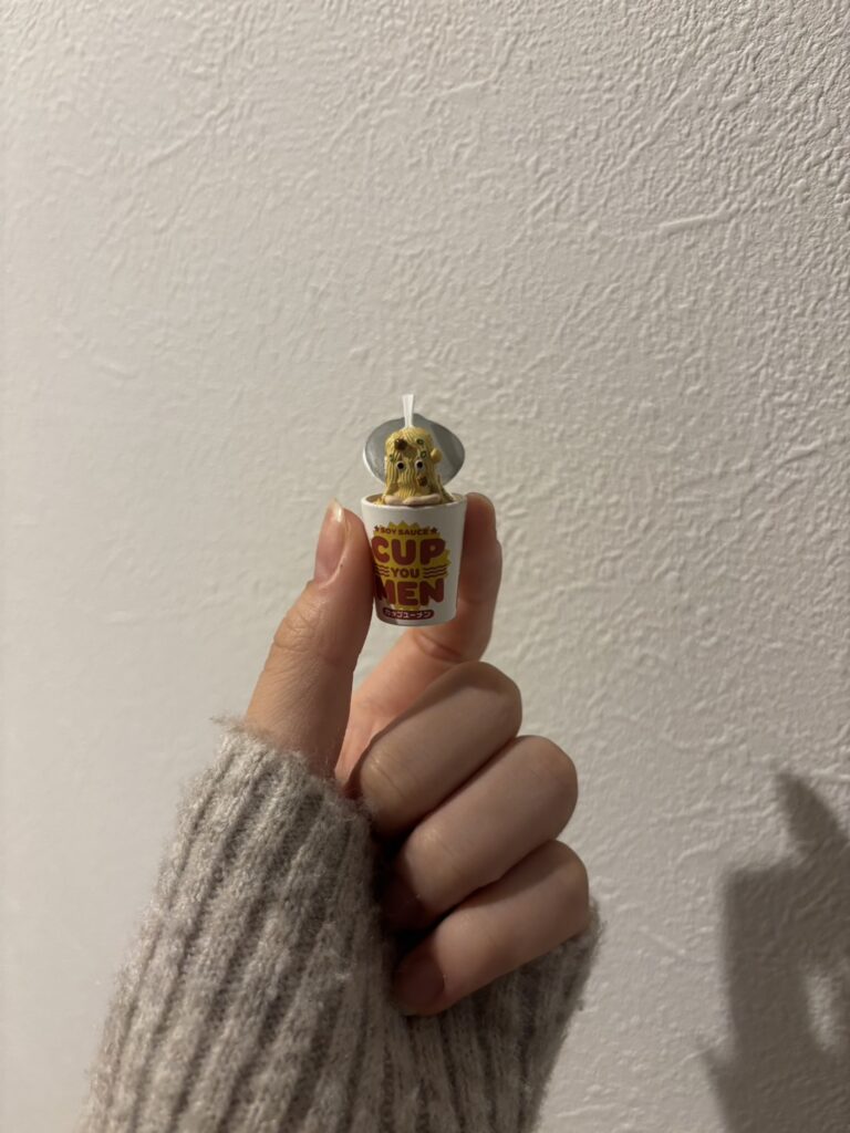 ハルハ「ガチャガチャはめっちゃ回す派!特にお菓子系はついついやっちゃう!これはハルハがいちばん好きなガチャガチャ。ミニチュアのカップラーメンおばけだよ。大好きすぎて、机の上に飾っています!」