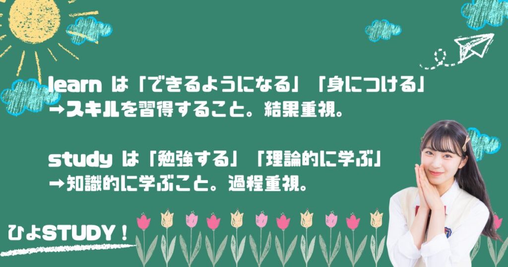 「これは分かった!learnとstudyってよく使う単語だからこそなんとなく感覚で選びがちかも…!今のうちに使い分けをマスターおこ♪」