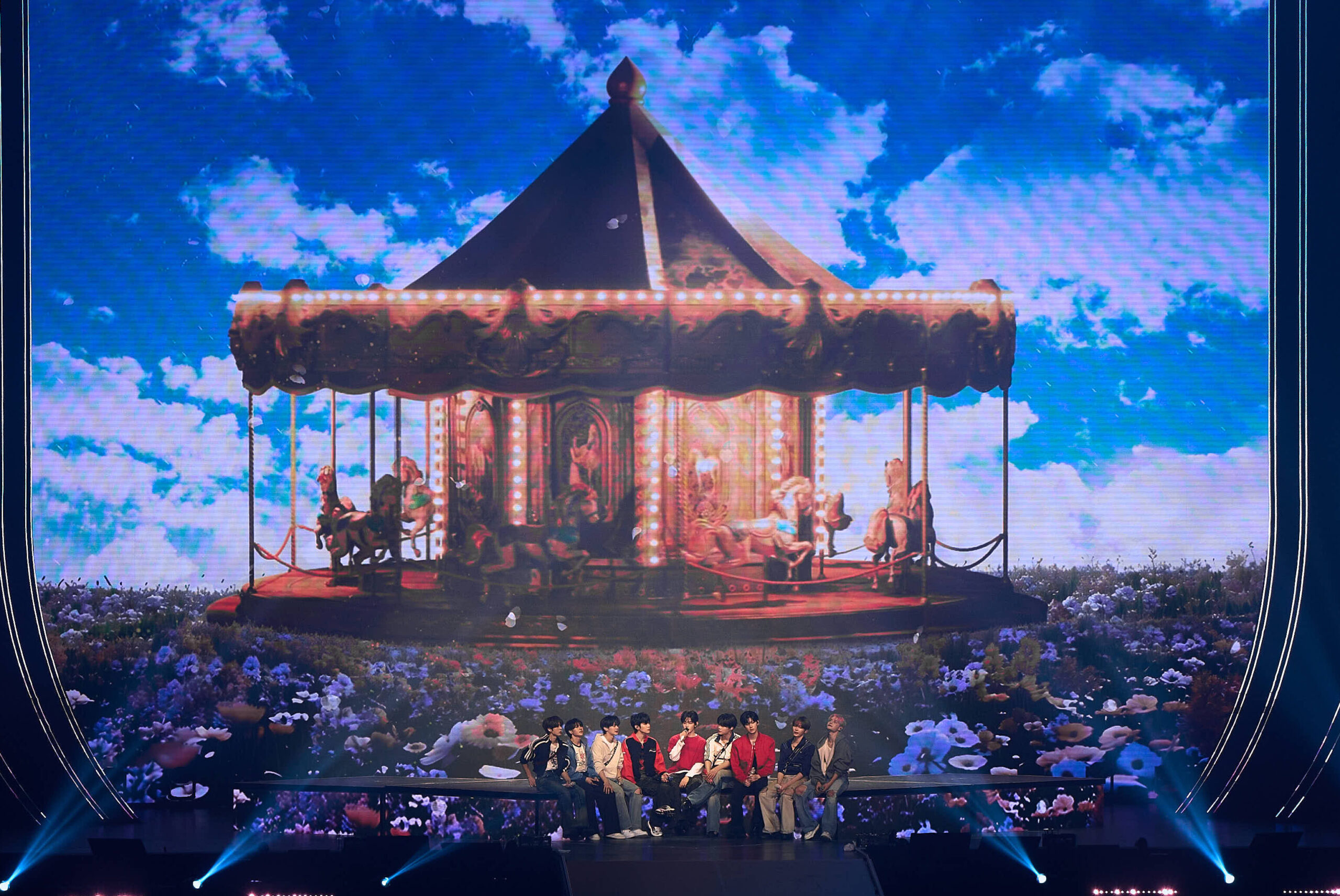 熱量そのままのMCタイムでは、キーワードに沿ったジェスチャーを一人ずつ披露してマネするミニゲームで一緒に楽しんだよ♫キーワード「かわいい」では、駄々っ子みたいに座って足をばたつかせるジャン・ハオ、髪の毛を触って「かわいい?」とつぶやくソク・マシューなど、思い思いの愛嬌にきゅん♡「イケメン」ポーズでは、ソン・ハンビンがMCを務める音楽番組で共演したSnow Manの「カリスマックス」ポーズを披露して大盛り上がり!キーワード「優しい」にちなんだポーズでは、キム・ギュビンが隣のハン・ユジンをなでなでして、会場がほっこりする場面も♡