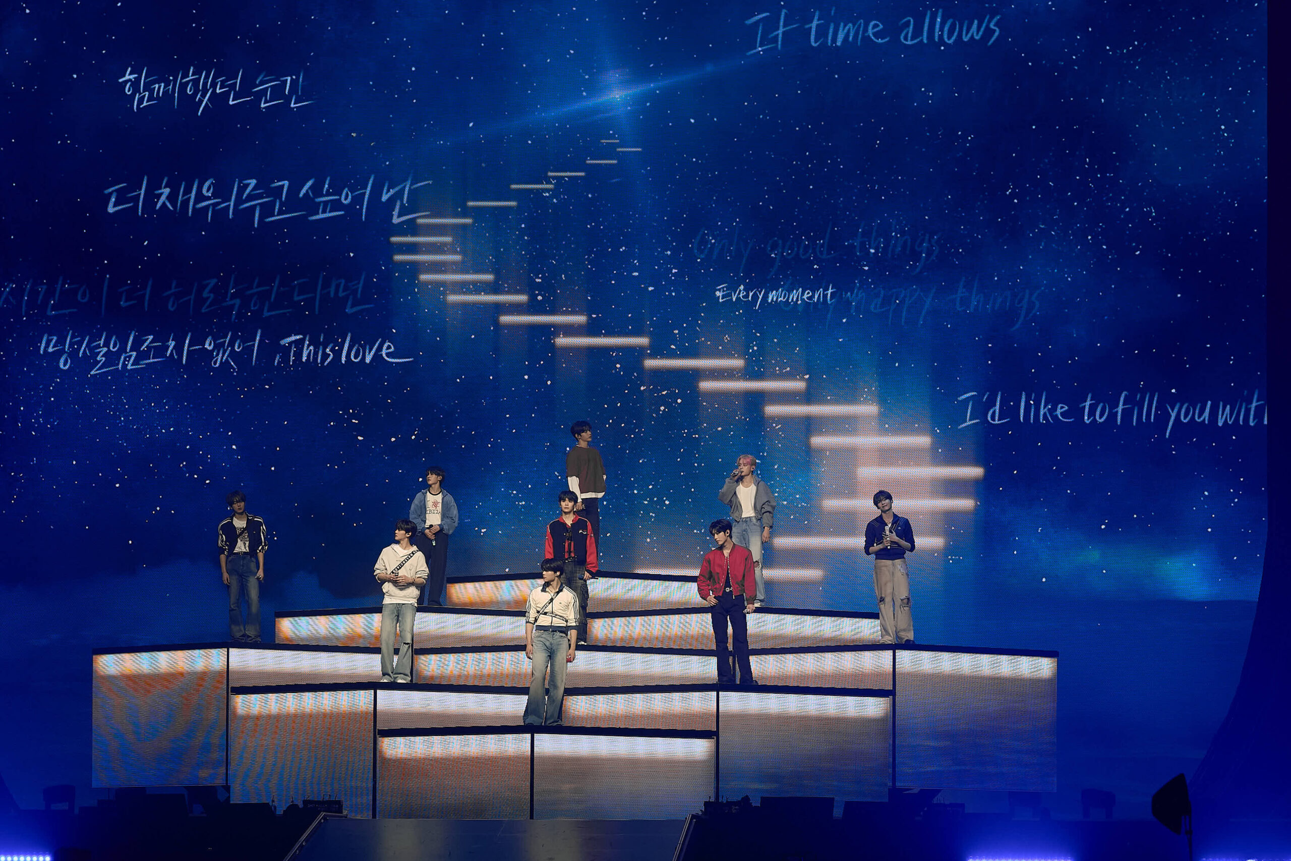 ハンドマイクで披露した「I Know U Know」は、ZEROBASEONEの歌唱力の高さを再認識できる9人の美しいハーモニーにうっとり♡肩を寄せ合い歌う「HANA」では、歌っているメンバーを優しく見つめるみんなを見て多幸感いっぱいに!続いて披露したのは、「Here I Am」!ますます成長した9人の姿に思わずうるうる。ペンライトいっぱいの会場と共に明るく締めくくる「Star Eyes」で本編が終了!