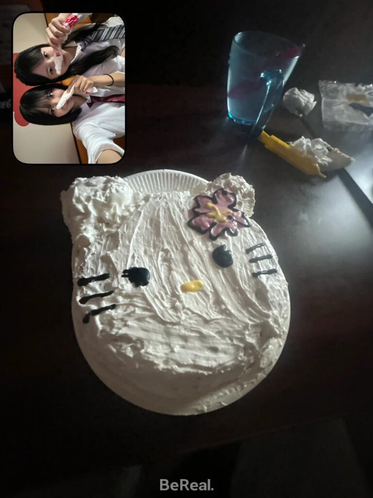 「友達とキティケーキを作った時のBeReal.!ケーキの位置も完璧だし、The青春って感じでお気に入りです✨✨ネクタイ制服もおそろいにして、jkっぽい感じにしたのも、この日のBeReal.のポイントです!!」by ワカナ