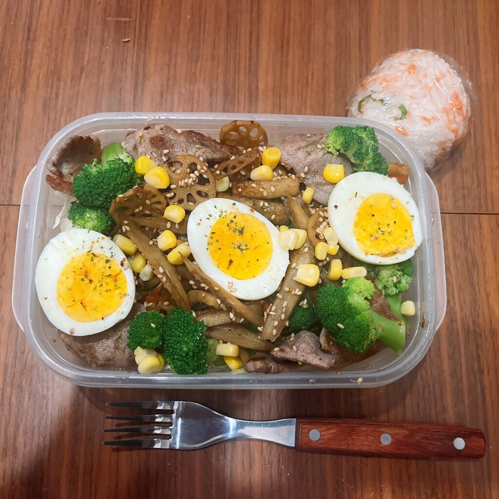 お弁当でダイエットをサポート。よく噛んで食べるように伝えています。炭水化物もゼロにするのはよくないので、小さなおむすびも一緒に!