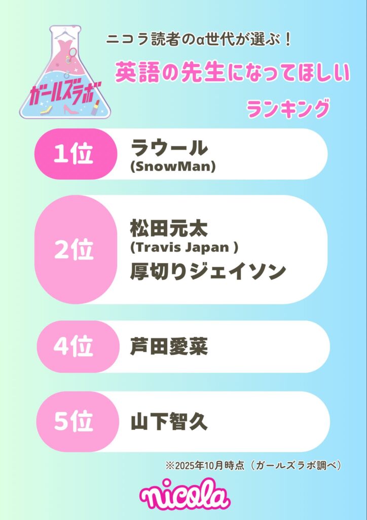 担任の先生になってほしい人堂々1位にはSnow Manの阿部亮平さんがランクイン!頭がいいからなんでも教えてくれそうとの声が集まったよ。英語の先生になって欲しい人ランキングでも、同じくSnow Manのラウールさんが優しく教えてくれそうと1位に!