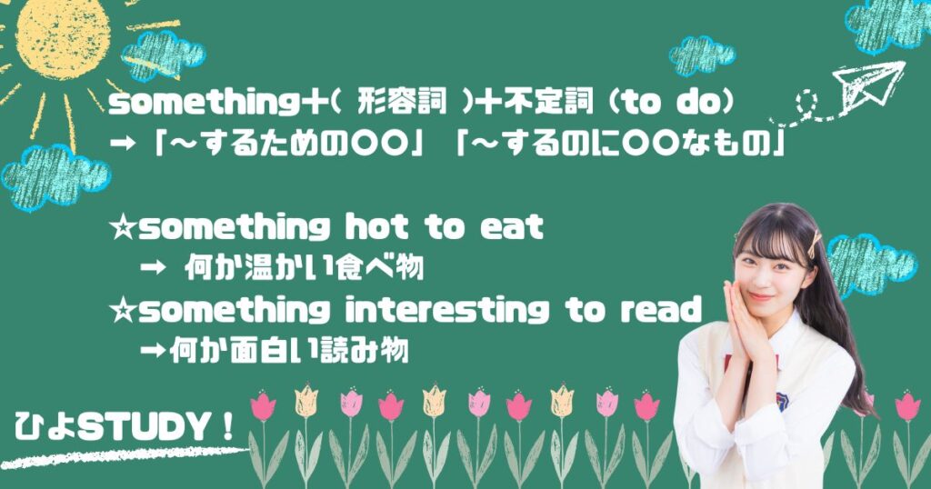 ・不定詞(to do)が「目的・使い方」、形容詞がsomethingを修飾し、そのものの「性質・状態」を表す。