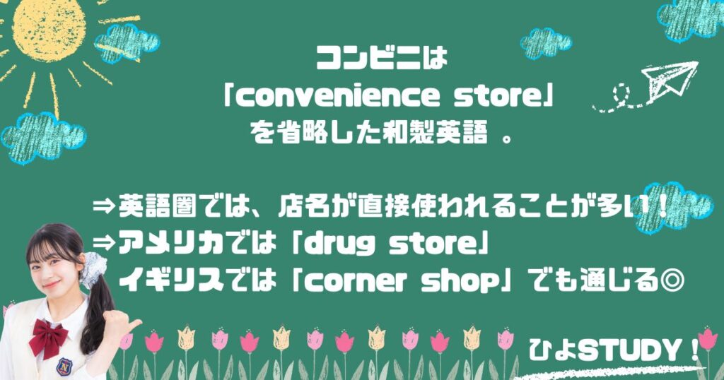 ⇒アメリカでは「drug store」、イギリスでは「corner shop(”街角にある小さな商店”の意味から派生)」が、コンビニエンスストアと似たような店を指す。