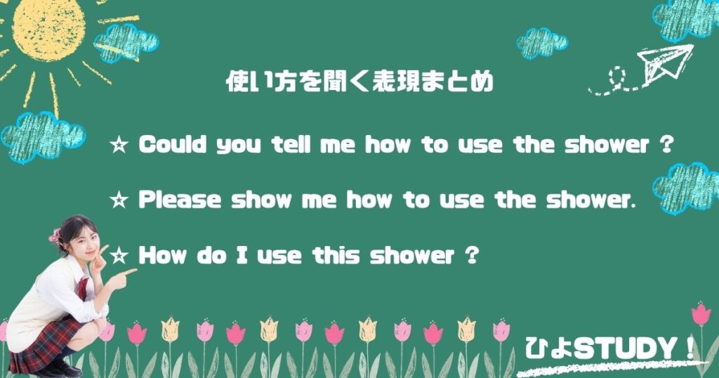 → 「シャワーの使い方」という名詞のかたまり。