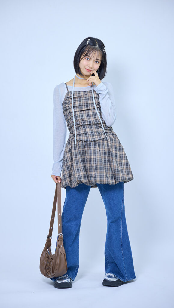 ワカナ☆チェックバルーンキャミワンピ¥3630、チョーカーつきロンT¥2530、バッグ¥3850/すべてems excite デニムパンツ¥8470/マジェスティックレゴン ヘアピンセット¥330/ラティス スニーカー¥4980/VIVIAN COLLECTION