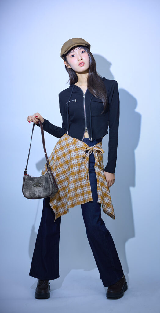 ヒナノ☆チェックラップマルチスカート¥1650/ラティス ジップカーデ¥6589/ヴォルカン&アフロダイティ 渋谷109店 デニムパンツ¥8250/マジェスティックレゴン ハンチング¥2090/ギャレッツ 渋谷109店 バッグ¥4620/ANAP GiRL シューズ¥8800/オリエンタルトラフィック(ダブルエー)