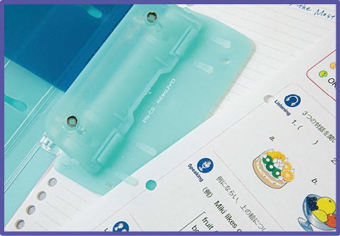 ②バインダーに直接セットできる薄型パンチ。配られたプリントも即整理!