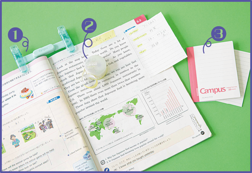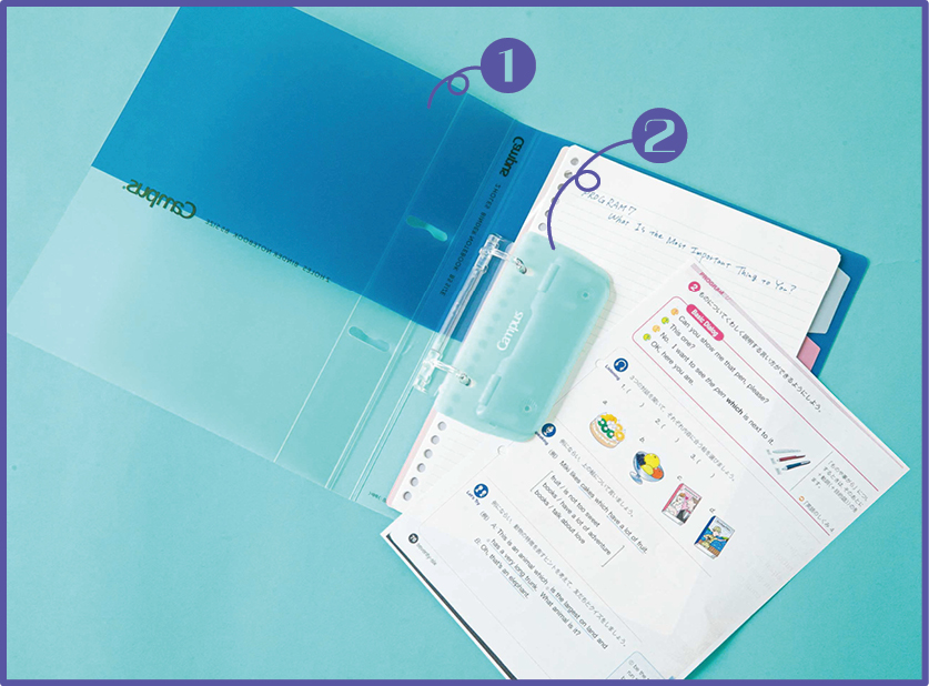 ①ルーズリーフもプリントも1冊にひとまとめ。整理整頓しやすく復習に便利!