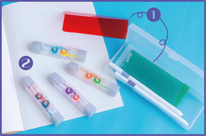 ②消しゴムで消せるラインマーカー。1つに2色のテープが入っていて、左端のレッド&グリーンは暗記用に使えるよ!