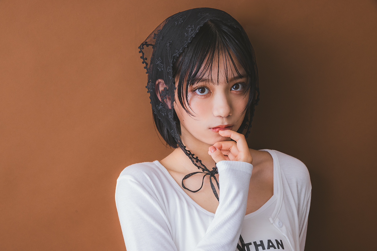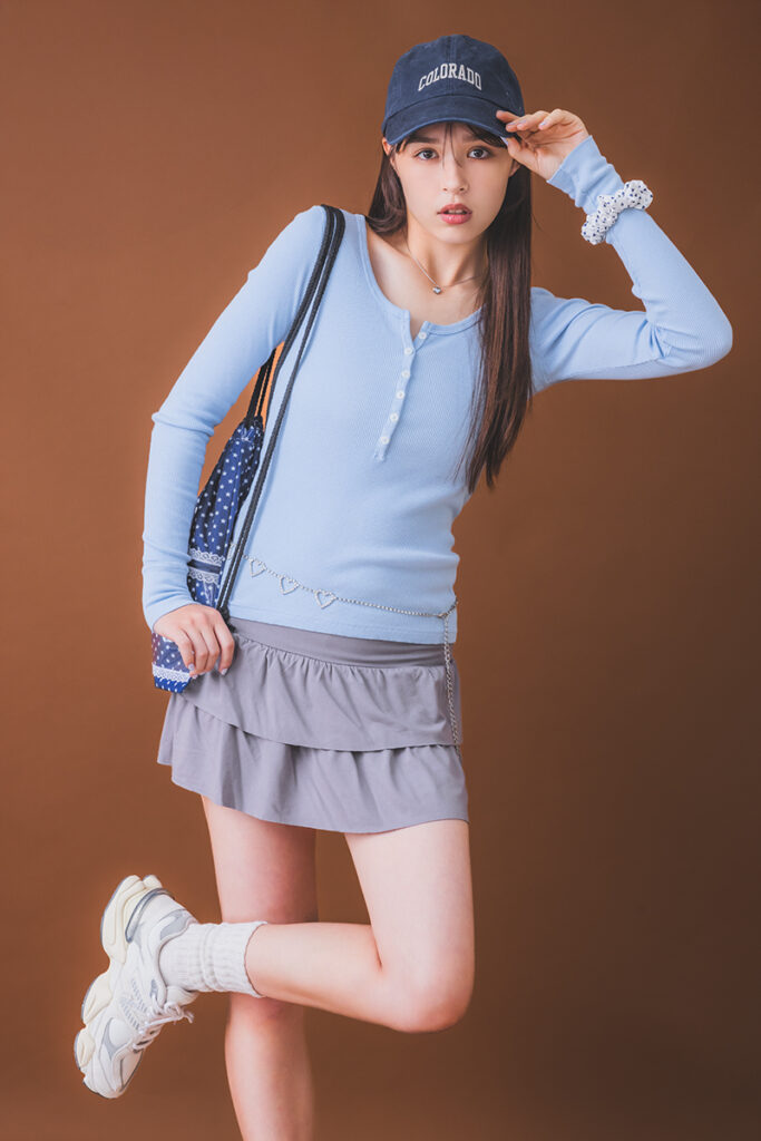 ハルハ★カットソー¥2800、ティアードスカート¥3200、キャップ¥2000、手首につけたシュシュ¥400/すべてBrandy Melville ネックレス¥1430/パリスキッズ 原宿本店 バッグ¥3289/SPINNS チェーンベルト¥770/WEGO ソックス(3足セット)¥1188/チュチュアンナ スニーカー¥24200/ニューバランス(ニューバランスジャパン)