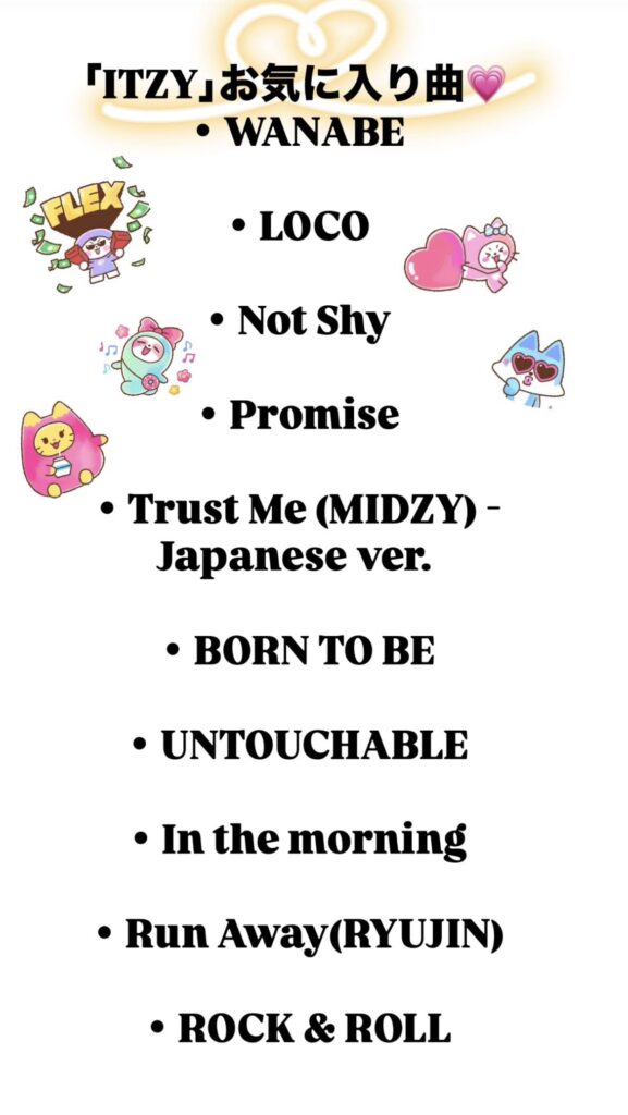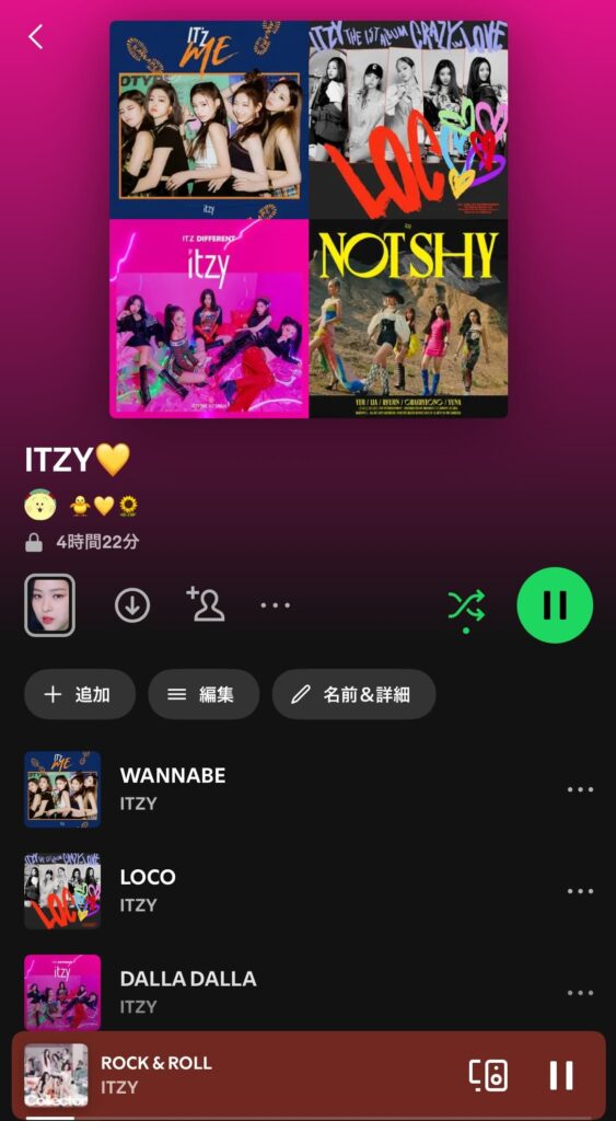 私は、基本、音楽はSpotifyで聞くんだけど、プレイリストでITZYの曲だけを全部まとめて、それでITZYの色んな曲を聴いているよ🤍