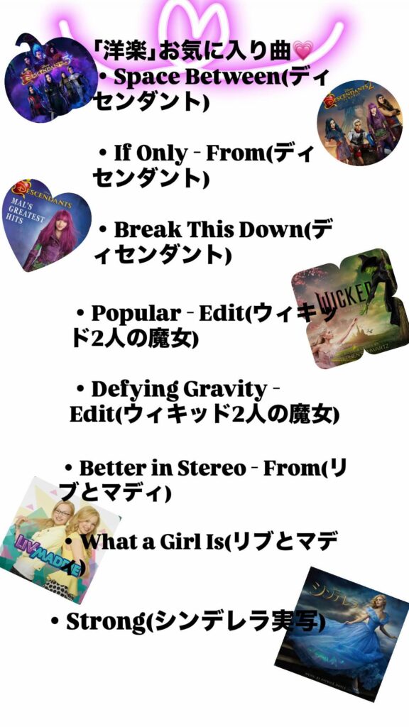 こんな感じで私が基本聞く洋楽はディズニー系が多いよ!!