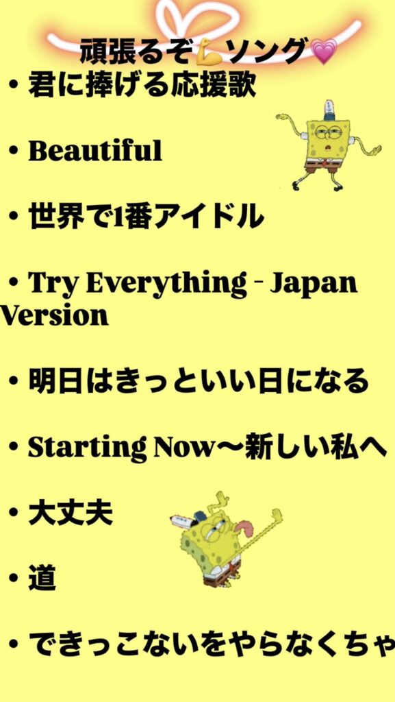 ここで、私が頑張るぞって時、気持ちが少し沈んでしまってる時やレッスンの前に聴く、気合と自信が入るエールソングを紹介!!
