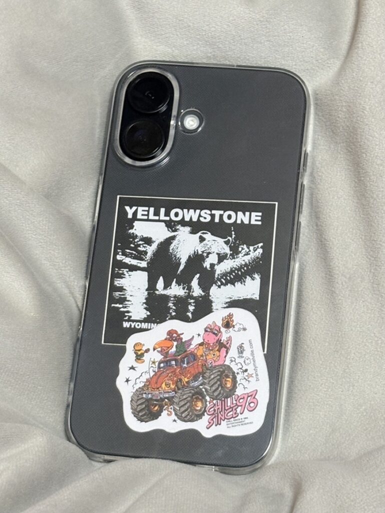 「機種変えたばっかりでケースがなくて今はDAISOの透明を使ってます!お気に入りポイントは中のシール♡今回はスマホ自体をブラックにしたから、シールもシンプルなモノクロのシールを入れてみました♡かっこいい感じにした!!」