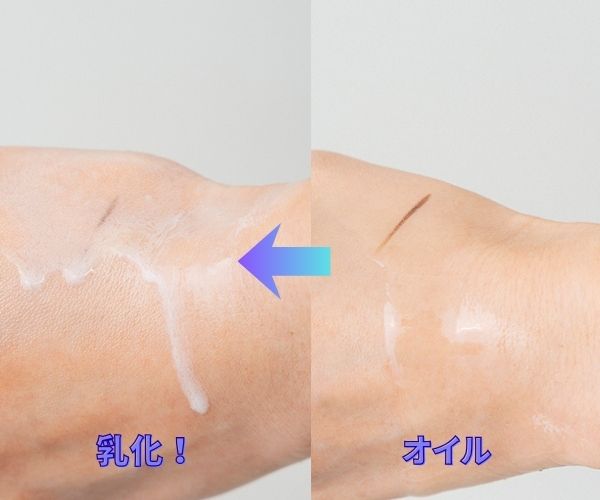 オイルと水が混ざり合い、白く濁ることを乳化というよ。汚れが浮いて落ちやすくなる!