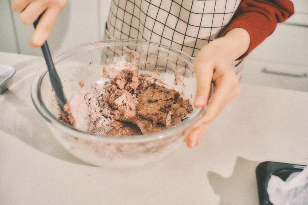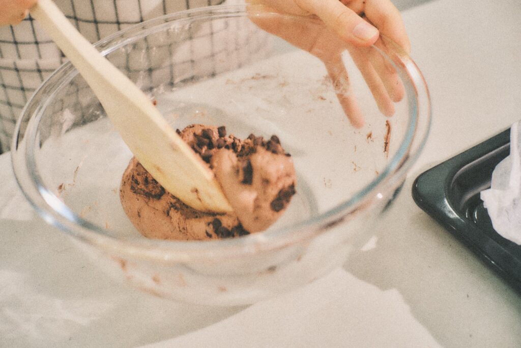 ①ボウルに材料Aを全て入れ、なめらかになるまでホイッパーでよく混ぜたあと、Bも加え木ベラもしくはゴムベラで混ぜる。生地が硬かったら、少しずつヨーグルトを加えて調整してね!ムラなく混ざったらチョコチップを投入♩