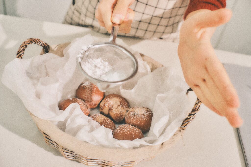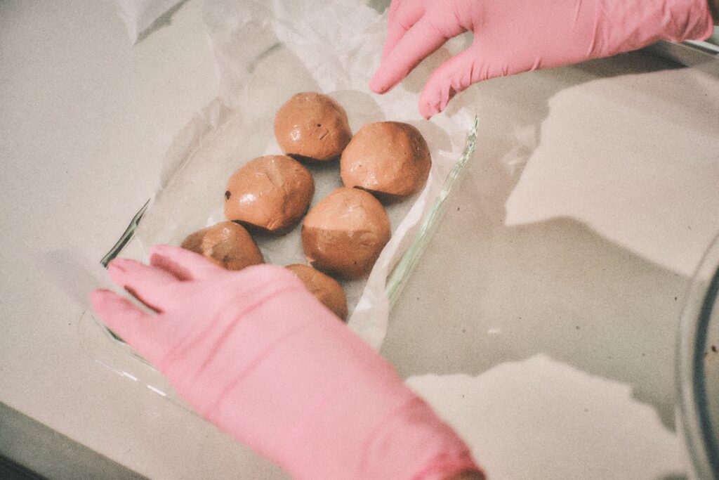 ②お好みで4〜6等分して丸める。耐熱容器にクッキングシートをしき、生地を並べたら500wのレンジで3分加熱して完成!