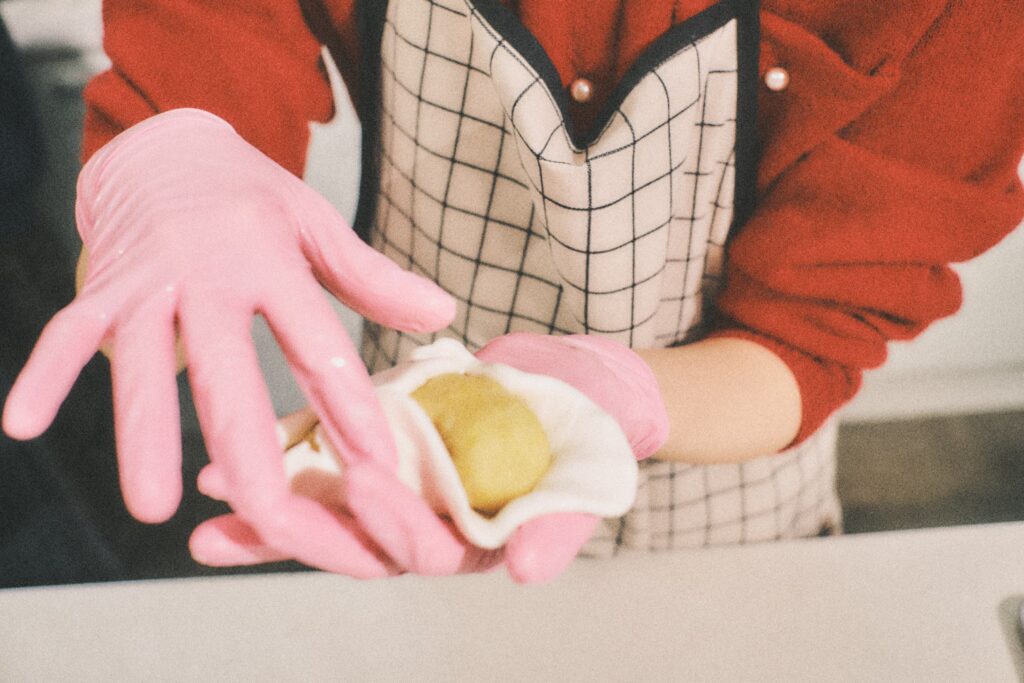④もちもち生地を手のひらでうすくのばし、さつまいもフィリングを包む。もちもち生地が柔らかいので、破らないように注意!手に油をつけると包みやすいよ。