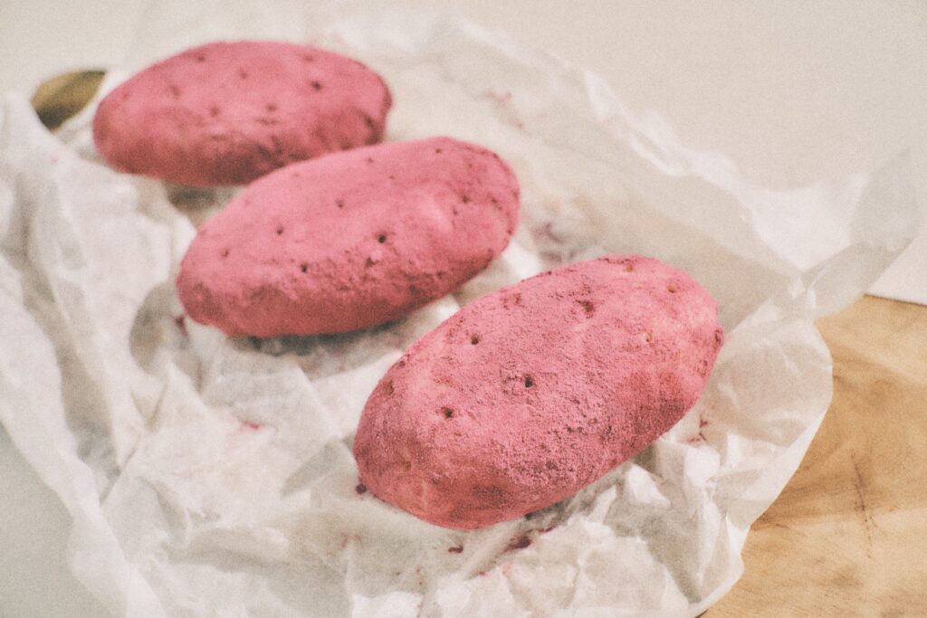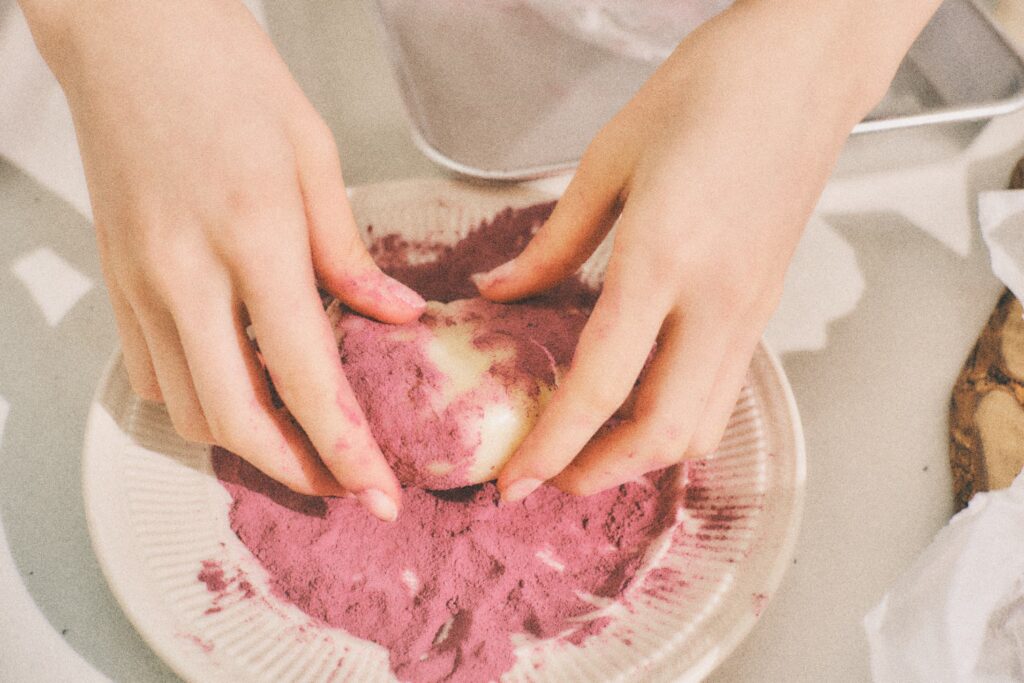⑥ラップを外し、紫芋パウダーをまぶして、爪楊枝でさつまいものようなくぼみをつけたら完成★