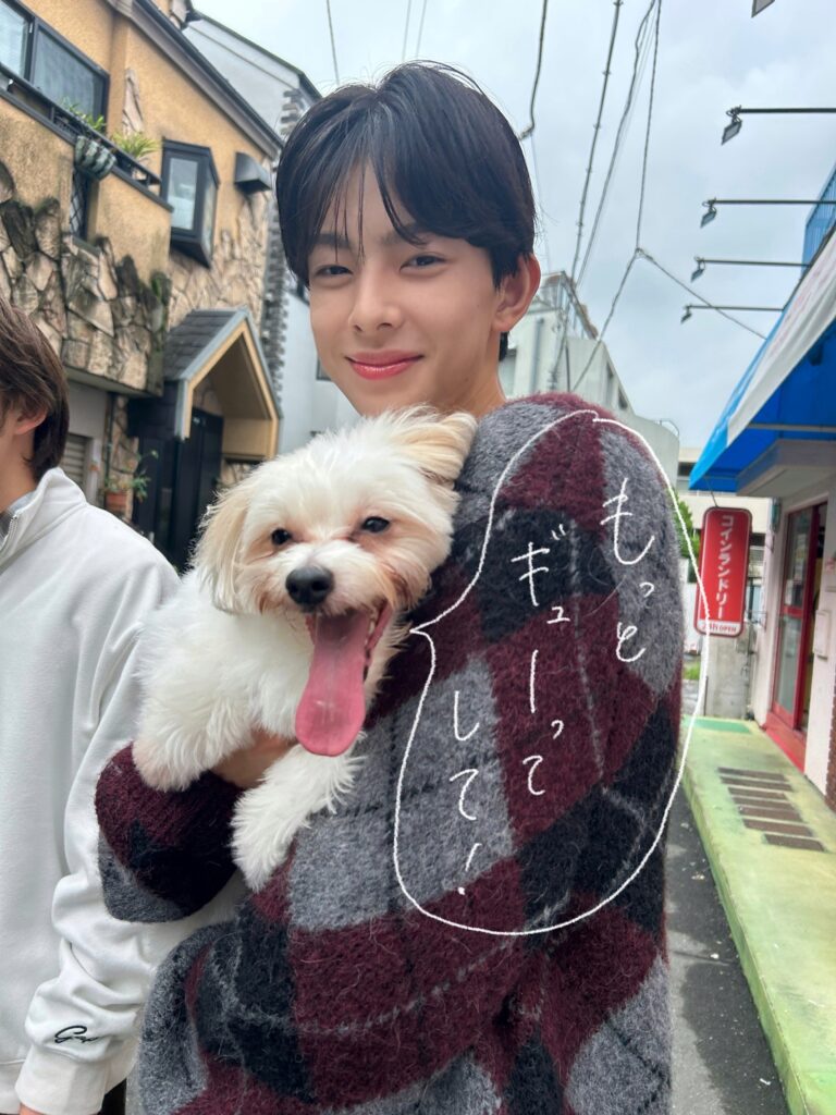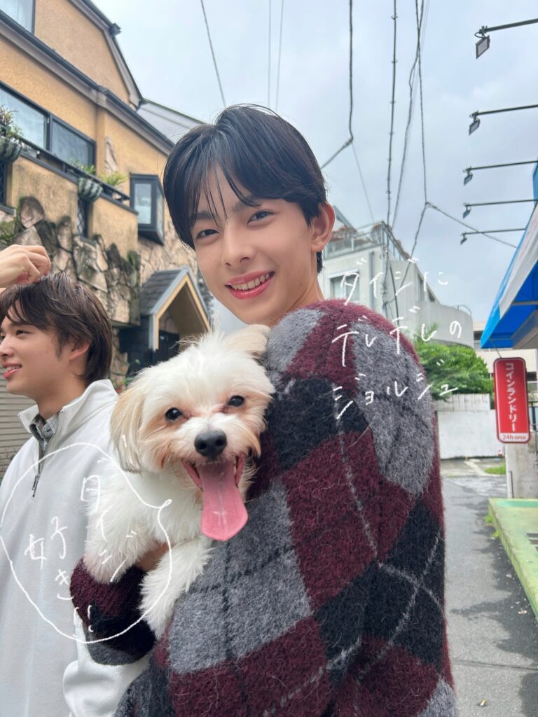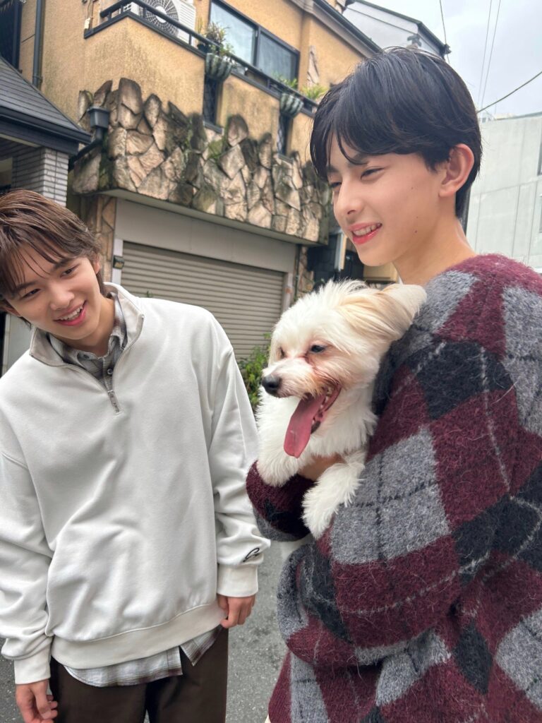 たま〜に撮影現場に現れるニコラドッグ、ジョルジュ参戦!犬好き男子二人の撮影に参加したよ。まだまだ暑い中、ニットを涼しげな表情で着こなすメン㋲の横で、超暑そうにはあはあしているジョルジュ。涼しそうな顔して〜って言われるけど、むりむり!だって僕犬だもん!みんなにかわいがってもらえてハッピーそうにしていました。